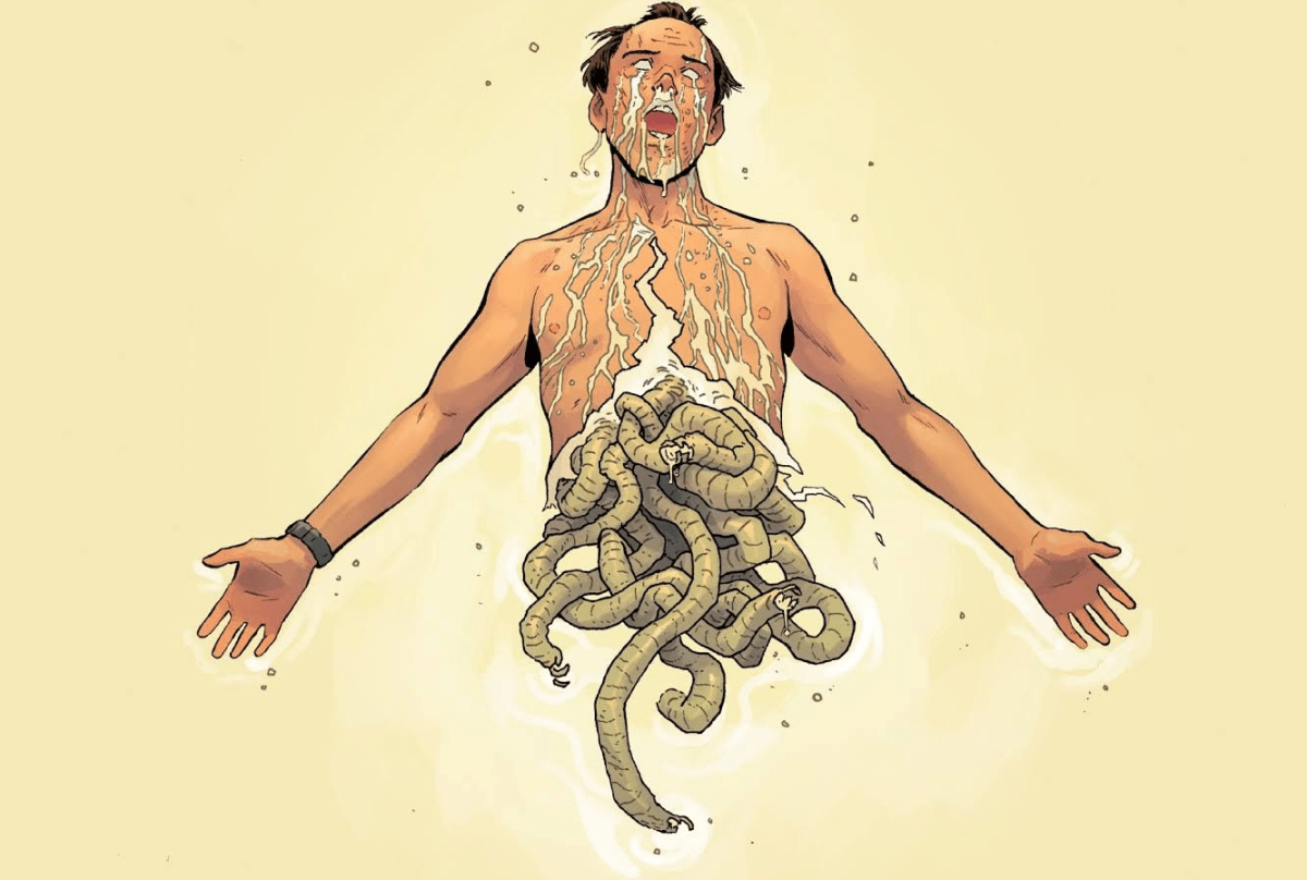 Back at the Agincourt household, Edward shows off a golden robot body to Dr. Lazarus. She then decides to make her escape as she pulls the mechanical being down on top of Coffin. Edward orders his ED-209 to shoot her, but only to cripple. However, she darts by him causing Agincourt to get hit by own machine. Unfortunately, Coffin manages to recover and shoots at Marie in order to prevent her escape. With Edward badly bleeding, On & Fai prep his body for his main project. As such, Issue 3 ends with Coffin telling Dr. Lazarus to help out or he’ll shoot her.