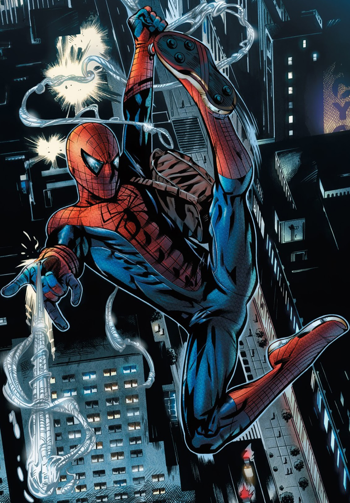 He manages to shoot a web strand onto the walkway and hang on for dear life, but a mercenary comes in and attempts to finish him off. Spidey is then able to take him out with some webs, but the perp was able to have a stray shot hit Peter’s wrist, causing him to lose his grip and plummet towards the centrifuge.